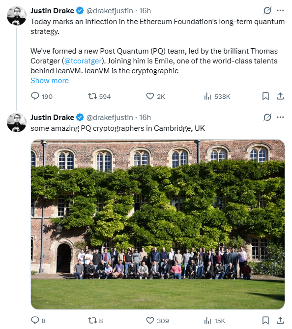 以太坊走了一条不同的道路,但得出了相似的结论。以太坊基金会的Justin Drake宣布成立一个由Thomas Coratger领导的后量子专门团队。此举将已进行多年的工作正式化,但此前很少在公开场合强调。