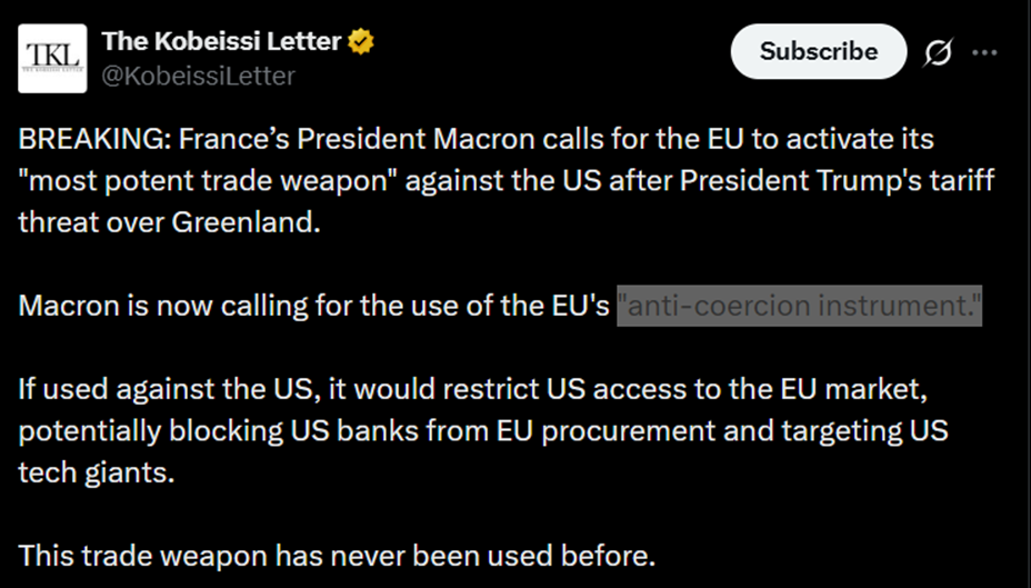 近期报道显示,法国总统马克龙正呼吁欧盟对美国采取严厉措施。此举源于特朗普总统近期对格陵兰的威胁,包括关税威胁。