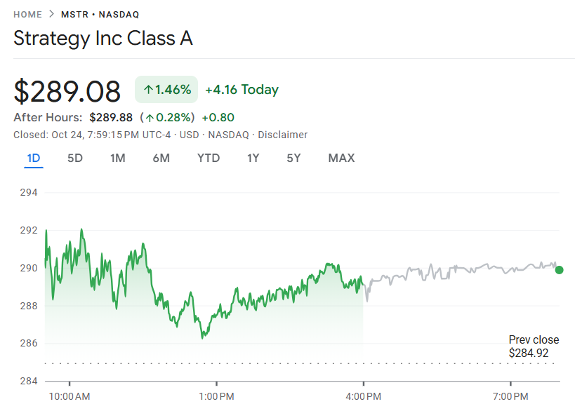 根据谷歌财经数据,MSTR股票当前报价为每股289.08美元。过去24小时内涨幅达1.46%,市值锁定在830亿美元。尽管该股过去六个月下跌26%,但年涨幅仍达23.36%。
