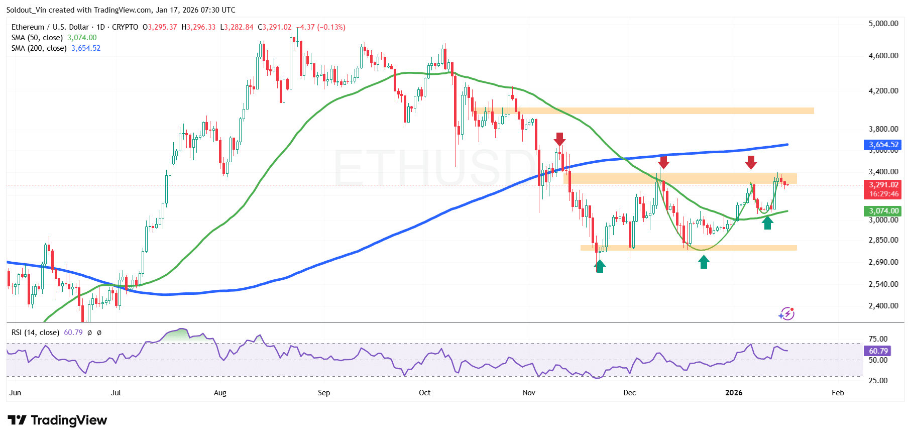 ETH/USD日线图分析显示,以太坊可能尝试向3350-3450美元阻力区域移动,该区域此前曾作为支撑。日收盘价若能站上该区域,则可能为进一步上探200日SMA(约3650美元)打开大门,这标志着下一个主要上行目标。