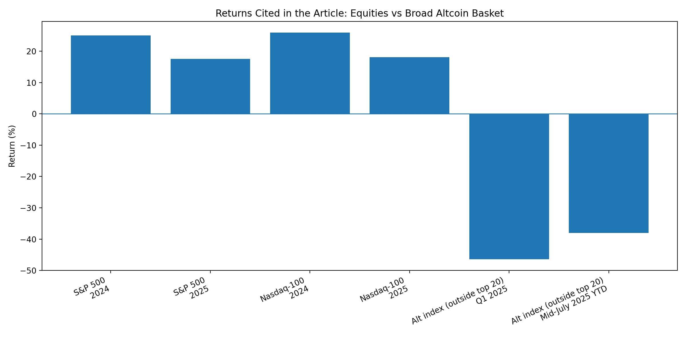 与传统风险资产的对比令人震惊:2024年标普500指数上涨约25%,2025年继续上涨约17.5%;纳斯达克100指数2024年上涨约25.9%,2025年上涨约18.1%。而同期,备受关注的非头部山寨币组合却遭受严重损失——2025年初季度下跌46.4%,截至七月中旬跌幅接近38%。这表明资金向小市值代币的传导效应微弱,以往的山寨币季节轮动规律已然失效。