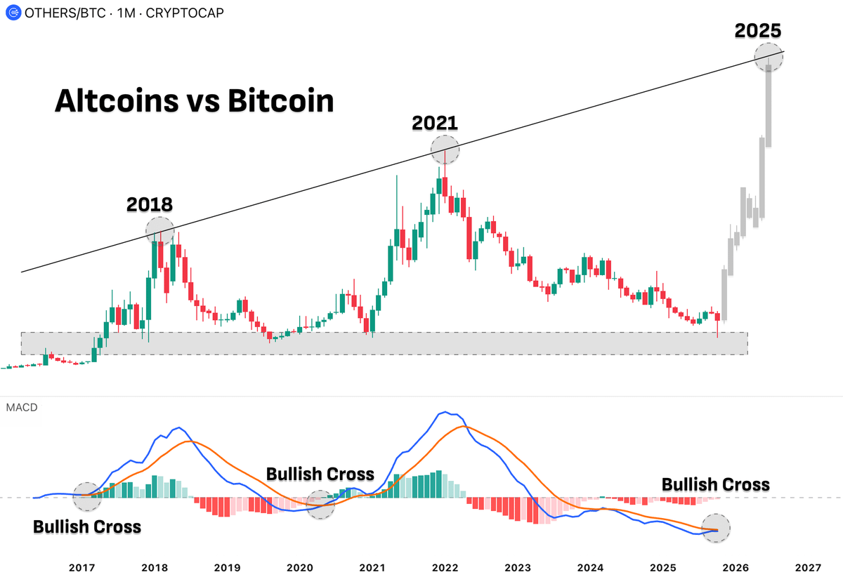 这一形态在过去八年中第三次形成,分析师认为可能预示"超级山寨币季"的到来。前两次该信号出现后,以太坊、瑞波币等主流山寨币对比特币的涨幅均达数百个百分点。 当前图表显示OTHERS/BTC交易对(衡量山寨币相对比特币的强势程度)从长期支撑位反弹,同时伴随新的MACD金叉,这与引爆2021年涨势的结构如出一辙。