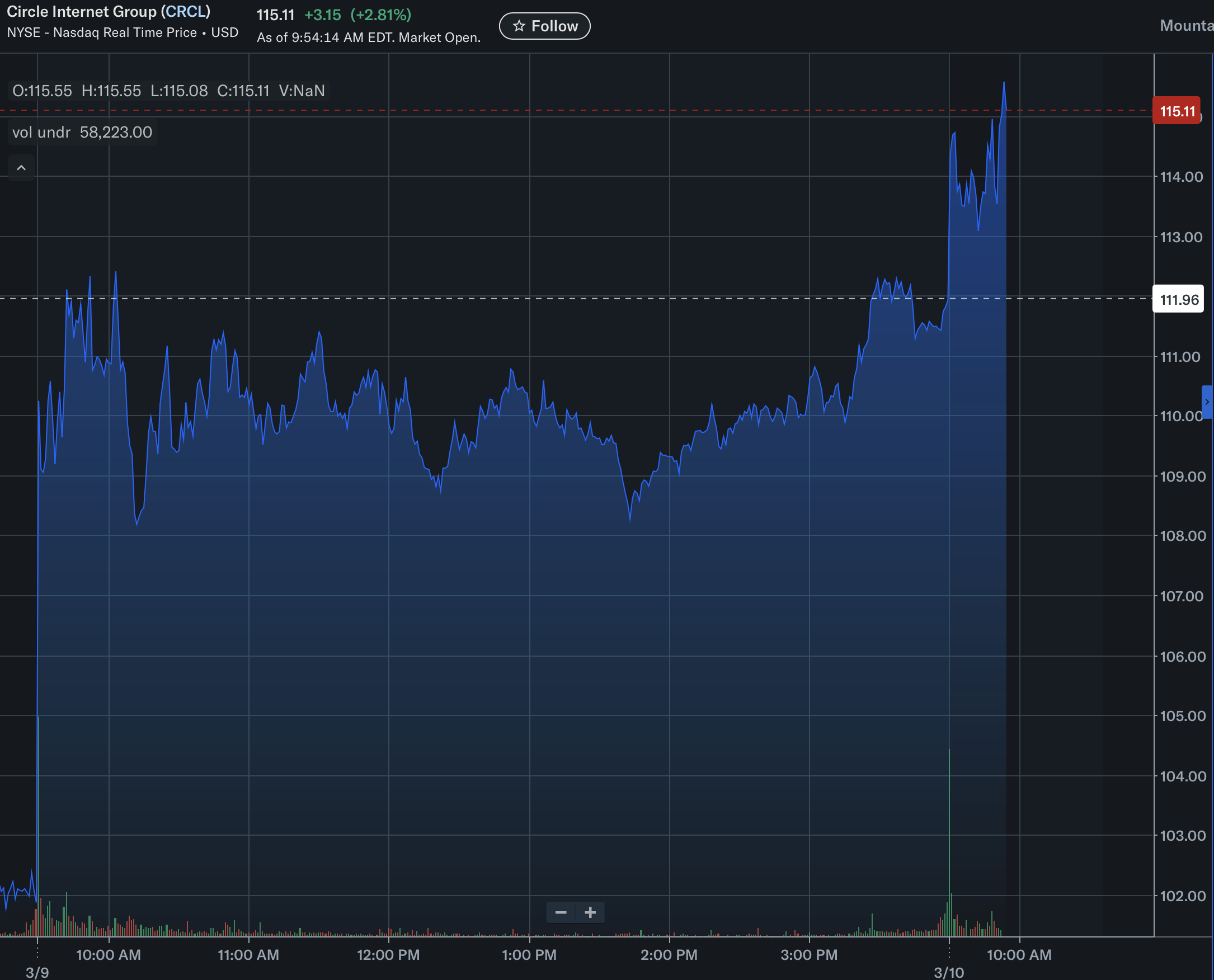 3月9日,CRCL股价上涨9.74%,收于111.84美元;随后在3月10日以115.11美元高开。此番波动源于Bernstein重申其“跑赢大盘”评级,并指出稳定币的普及仍处于早期阶段。
