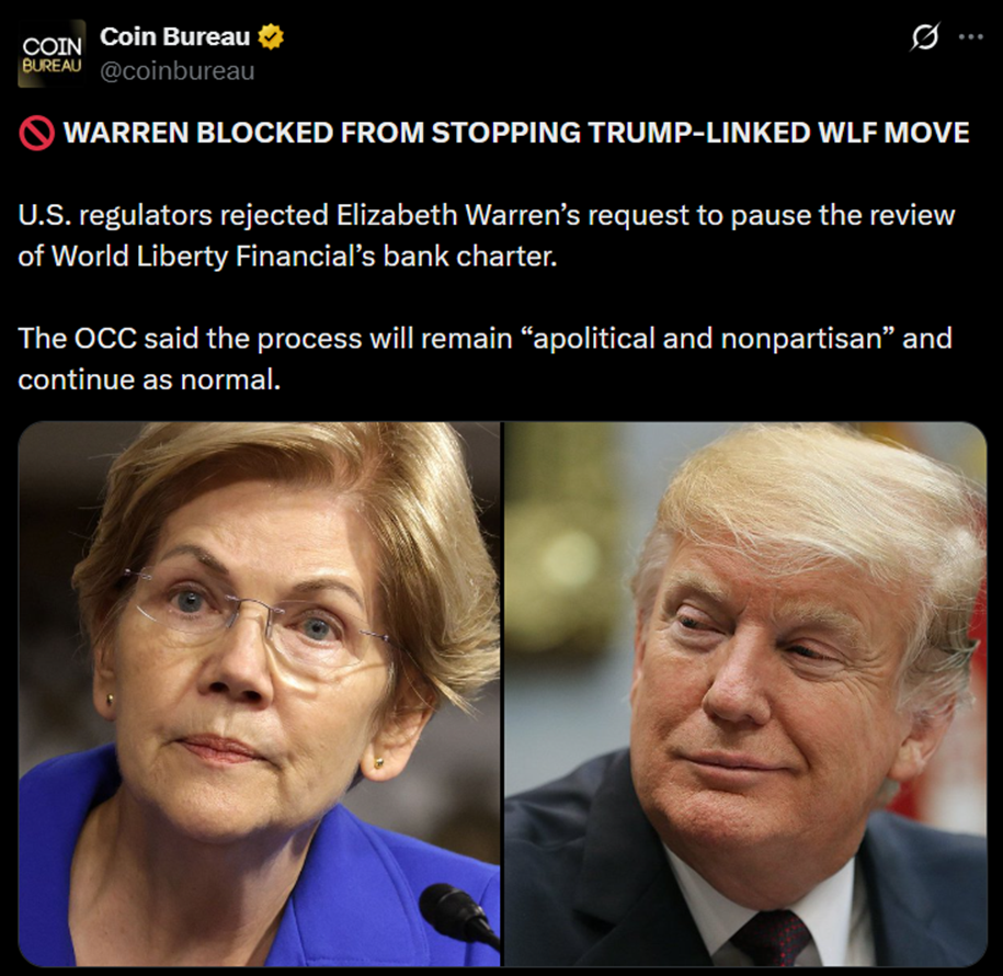 本月初(1月7日),WLFI通过WLTC控股有限责任公司向OCC提交了银行牌照申请。然而,不到一周后,美国参议员伊丽莎白·沃伦致信美国证券交易委员会,呼吁该监管机构暂停对WLFI银行牌照申请的审查。