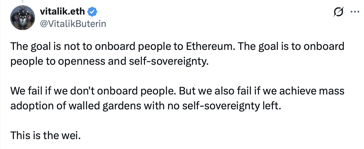 多年来,以太坊联合创始人维塔利克·布特林始终倡导加密领域的隐私保护。他认为仅仅吸引用户入驻还远远不够,并警告"围墙花园"的广泛使用将破坏去中心化系统的核心宗旨。"目标不是让人们加入以太坊,而是让人们拥抱开放性与自主权,"他最近在X平台发文强调。