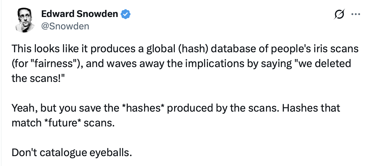 World的身份协议World ID设计让用户在不泄露个人数据的情况下证明其真实人类身份。根据项目文档,通过虹膜扫描完成生物特征验证后,数据会被加密发送至用户设备,并从验证硬件中删除,确保仅由用户控制其World ID,第三方无法获取个人信息。尽管这种基于生物识别的方法能大规模验证人类独特性,但批评者持续对其隐私保护和强制识别风险表示担忧。