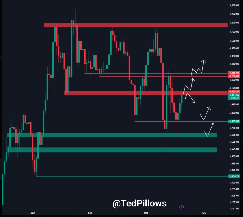 技术分析师表示,以太坊当前处于第五驱动浪——通常是最强劲的收官浪阶段,价格目标区间为7000至8000美元,这显示其仍保持看涨预期。分析师Ted Pillows特别指出,这个头部山寨币正对4100美元关键位发起重要冲击,突破该水平将宣告近期下跌趋势的终结。