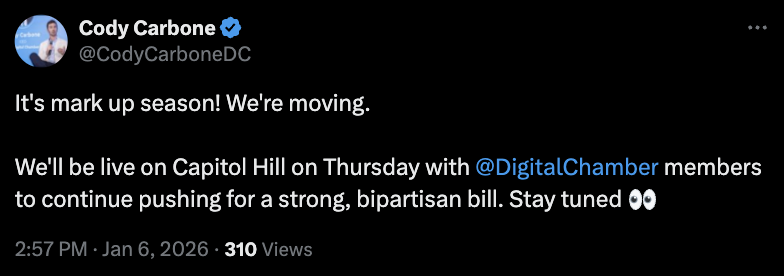 "考虑到当前势头以及过去三周跨党派取得的进展——即便跨越假期与新年周期——很难断定这项法案不会在今年早期完成。"卡邦分析道,"华盛顿内部确实存在赶在政治因素成为主要变量前完成立法的强烈意愿。"