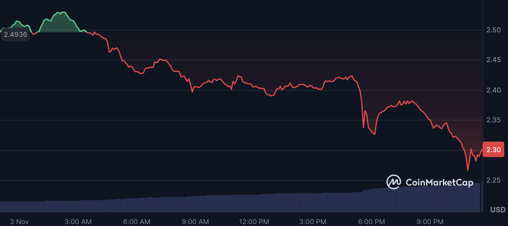 2025年11月3日,XRP价格下跌至2.30美元,24小时内跌幅达8.24%。此番下跌与加密货币市场整体颓势同步,由宏观经济担忧及杠杆清算潮引发。