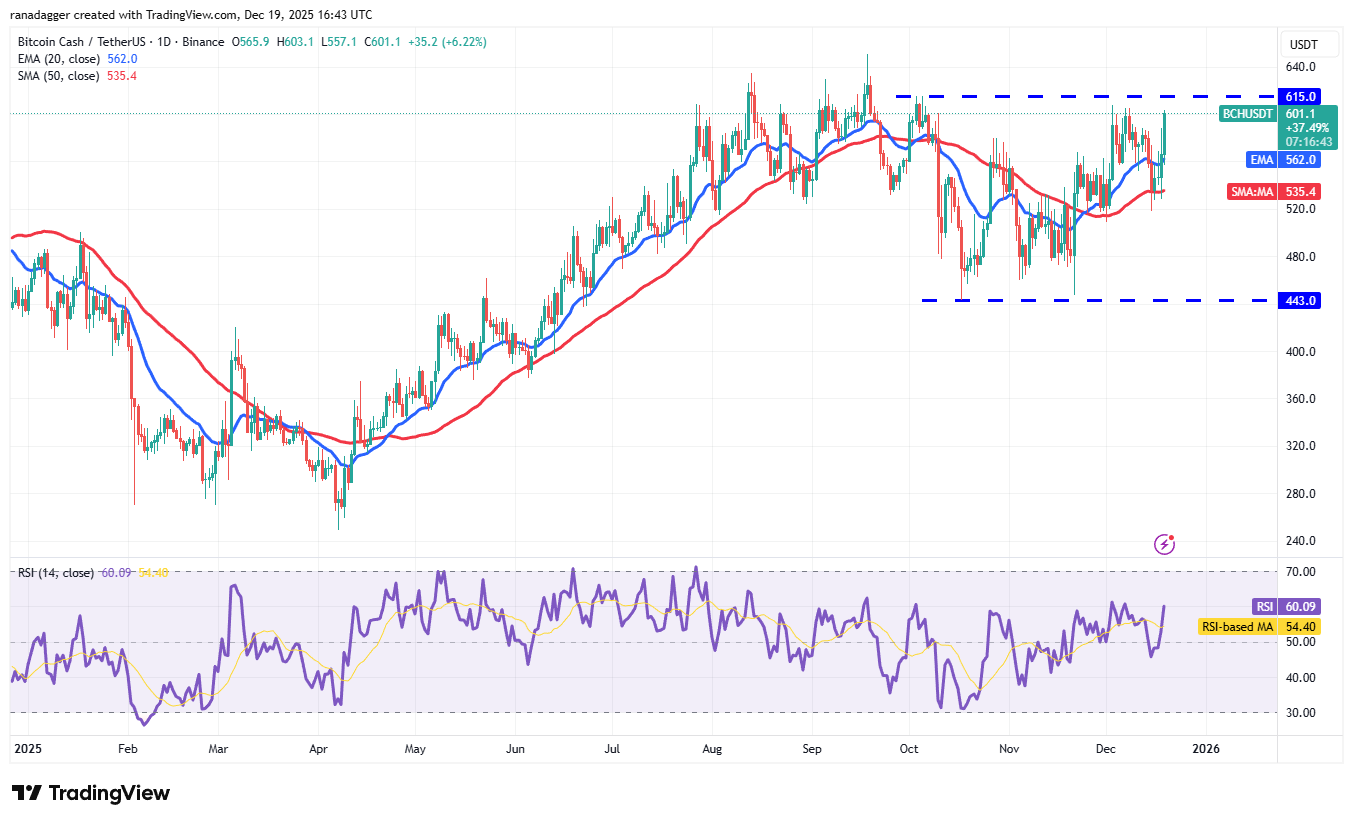 比特币现金买家成功守卫50日SMA(535美元),显示市场情绪积极。