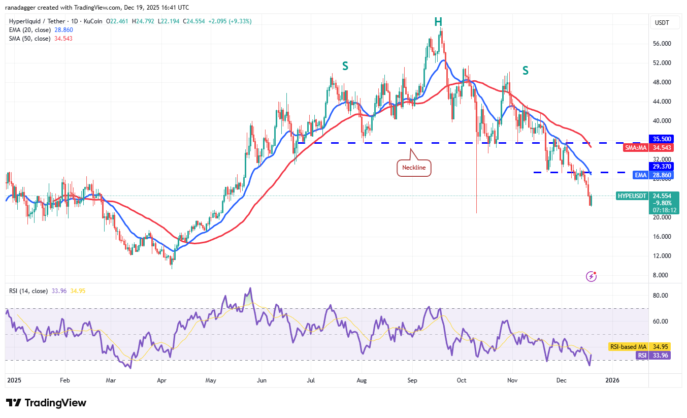 技术性反弹可能触及20日EMA(28.86美元),这是需要警惕的关键阻力位。若价格从20日EMA大幅回落,表明空头继续逢高卖出,这将增加跌破20.82美元支撑位的风险。若如此,HYPE/USDT交易对可能暴跌至16.90美元。