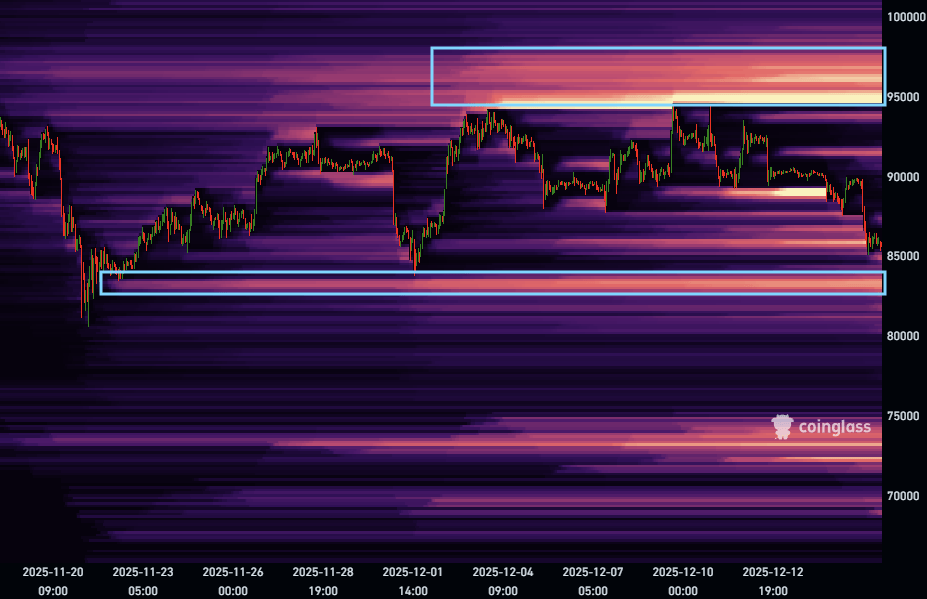 马克·卡伦预计聚集在95,000美元上方的空头流动性即将被清除,暗示该区域可能存在约8,000美元涨幅空间。但较小规模的清算可能首先在83,000美元处发生。若行情如预期发展,大规模空头挤压或推动现货价格突破98,000美元。