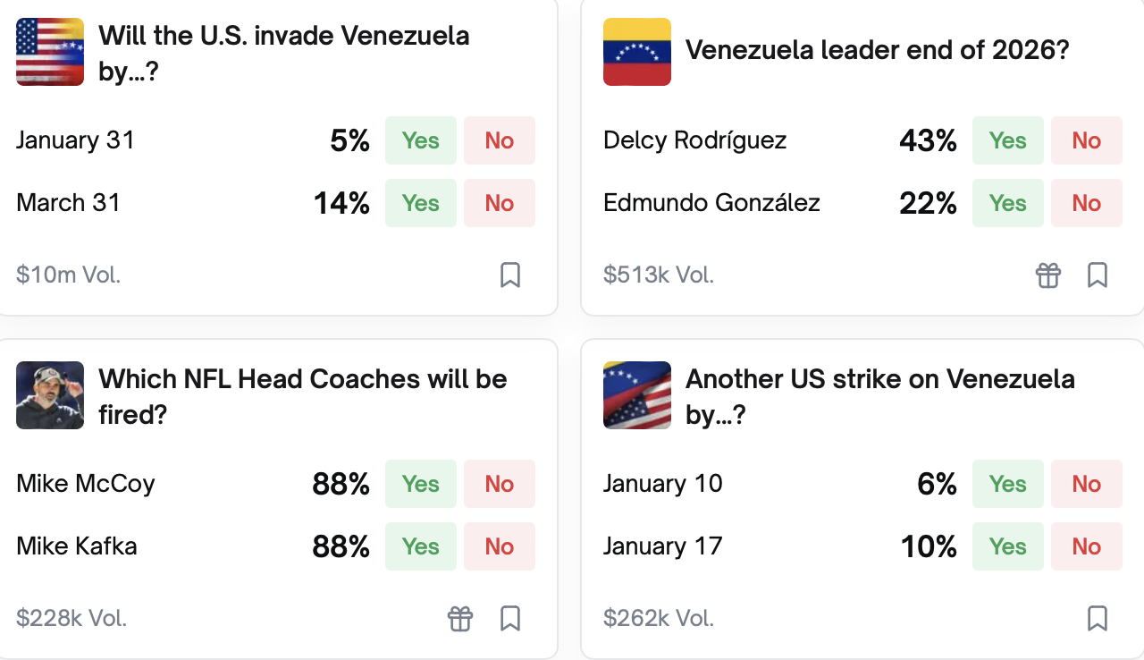 同年9月,据报道Polymarket在寻求高达100亿美元估值的新融资时,正考虑启动美国市场运营。此前6月,该公司刚完成由彼得·蒂尔联合创立的Founders Fund领投的2亿美元融资。11月,Kalshi传出获得红杉资本与CapitalG领投的10亿美元融资,估值约110亿美元,此前该公司在10月已完成3亿美元融资轮。