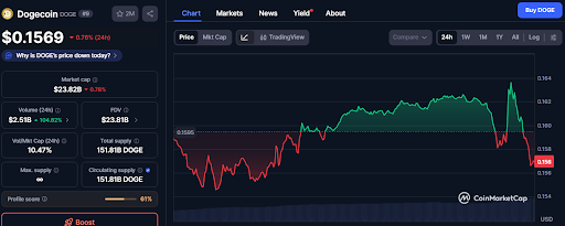 截至发稿时,CoinMarketCap数据显示狗狗币过去24小时持续震荡,现报0.1569美元,期间跌幅0.76%。从24小时图表可见,DOGE最初上扬至0.164美元高点附近,但迅速回落至当前价位。