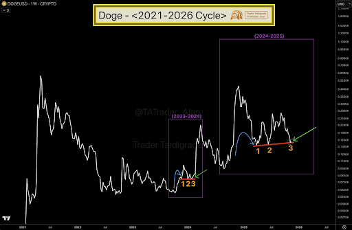 交易员Tardigrade的观察印证了CoinMarketCap结构,周线图显示价格探底回升的走势与2023-2024周期相符。狗狗币当前正在测试第三条支撑趋势线,这标志着周期中的关键节点。