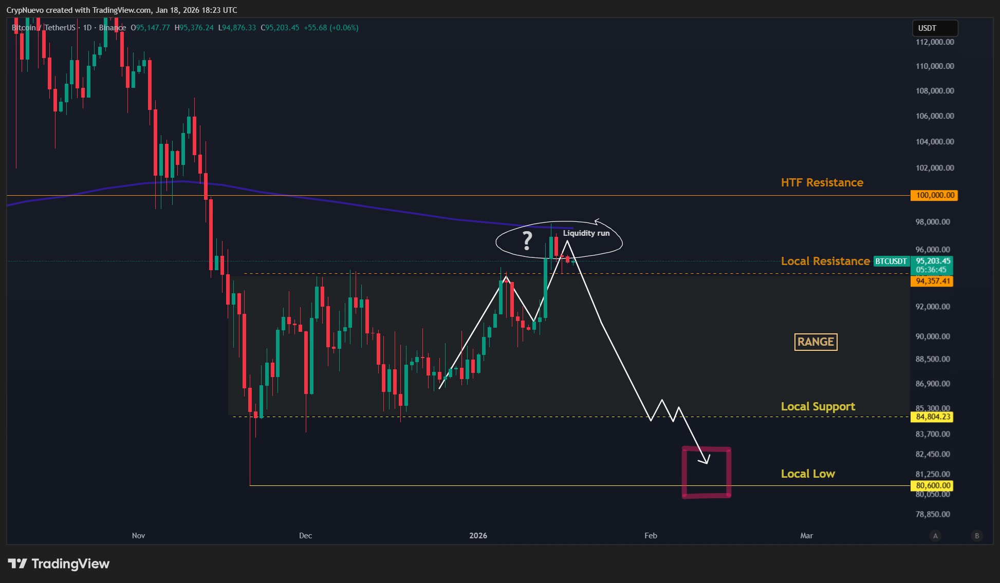 重要的支撑位包括约87,000美元的2026年年度开盘价,以及80,500美元的区间低点——这两者现在都已成为目标价位。