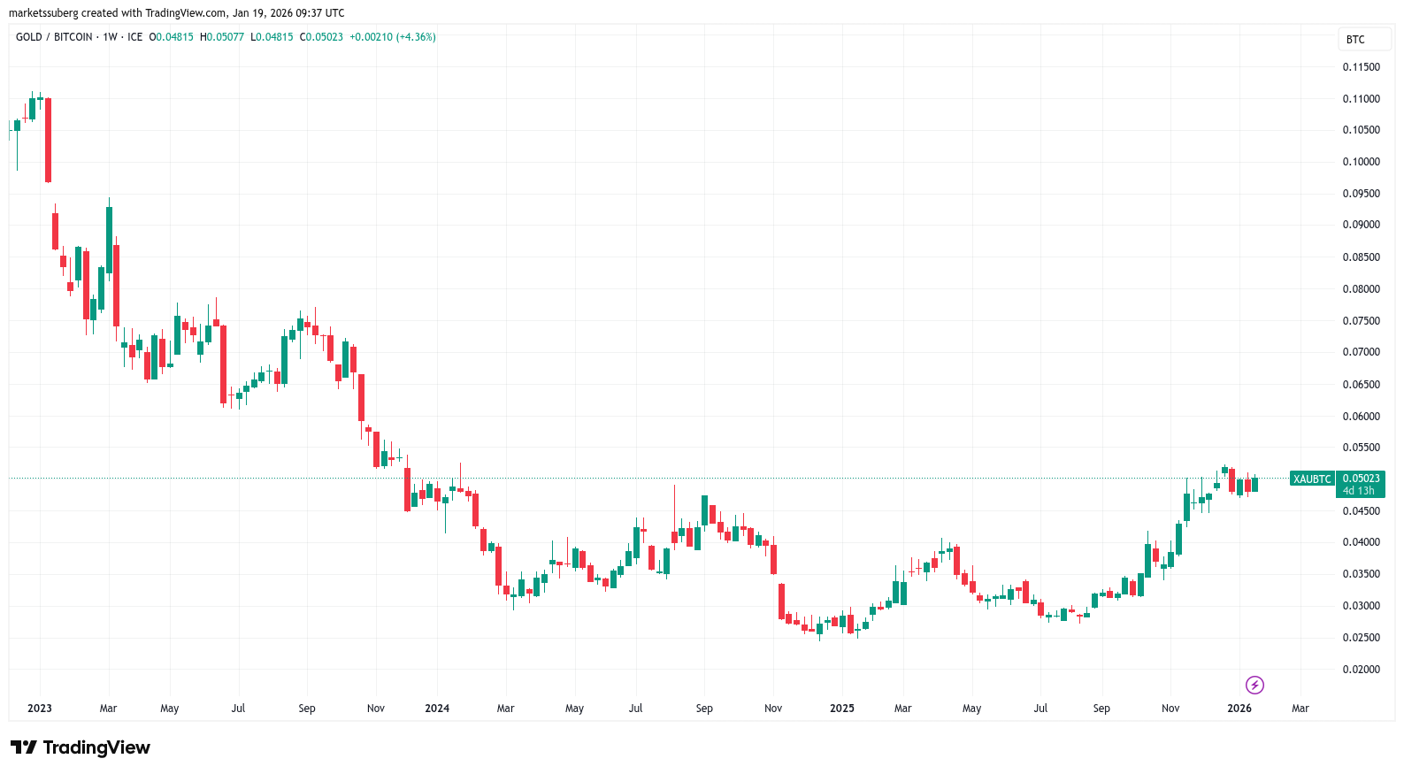 相对于比特币,黄金价格仍略低于两年高点,但自2025年8月以来,以比特币计价已几乎翻倍。