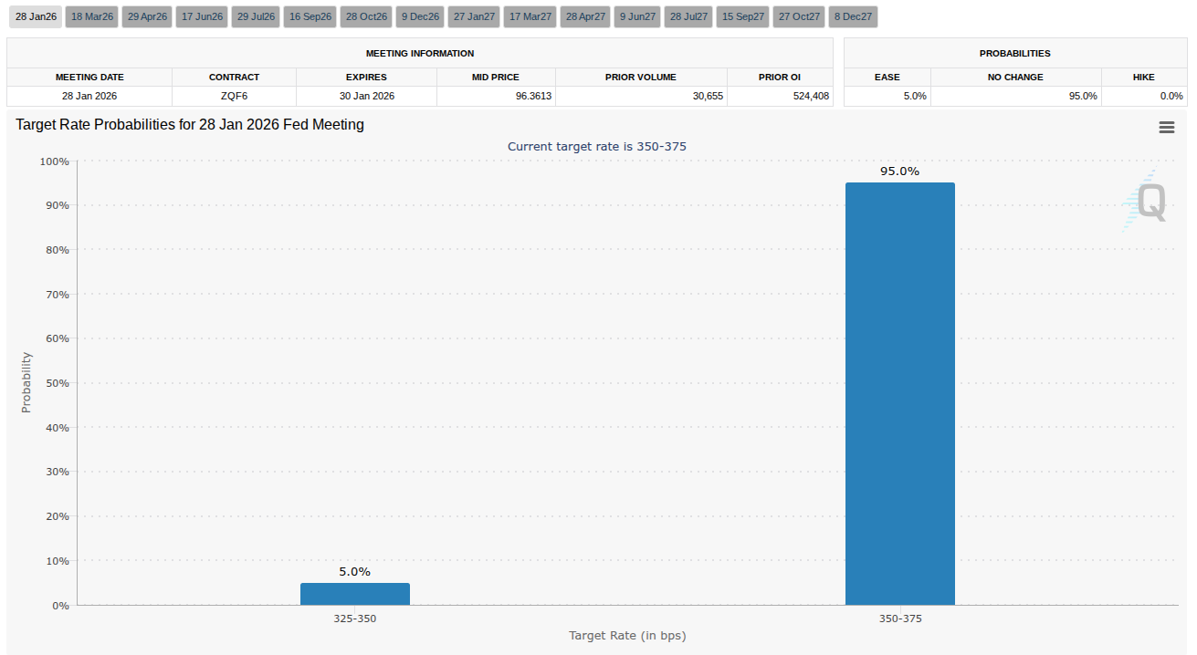 上周曾有报道指出美国通胀数据好坏参半,11月的消费者价格指数(CPI)和生产者价格指数(PPI)走势分化。与此同时,市场普遍预期美联储将在1月会议上维持利率在当前水平,这不会为加密货币和风险资产提供流动性缓解。