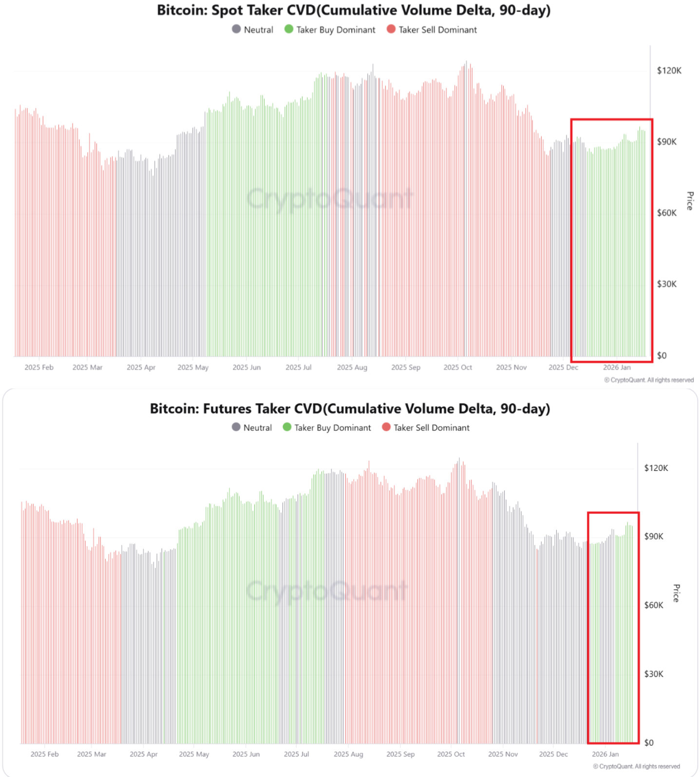 CryptoQuant进一步说明:“现货主动成交方CVD首先明确从卖方主导转为买方主导,随后期货主动成交方CVD跟随了这一趋势。这表明市场并非处于过热上涨的末期,而是处于需求复苏的早期阶段。”