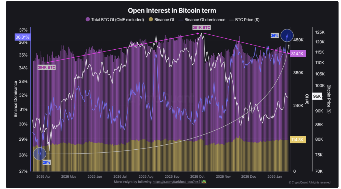 创纪录的流动性蒸发,下行压力持续存在。CryptoQuant指出,自那时起,衍生品总未平仓合约(OI)以比特币计价已下降近17.5%。