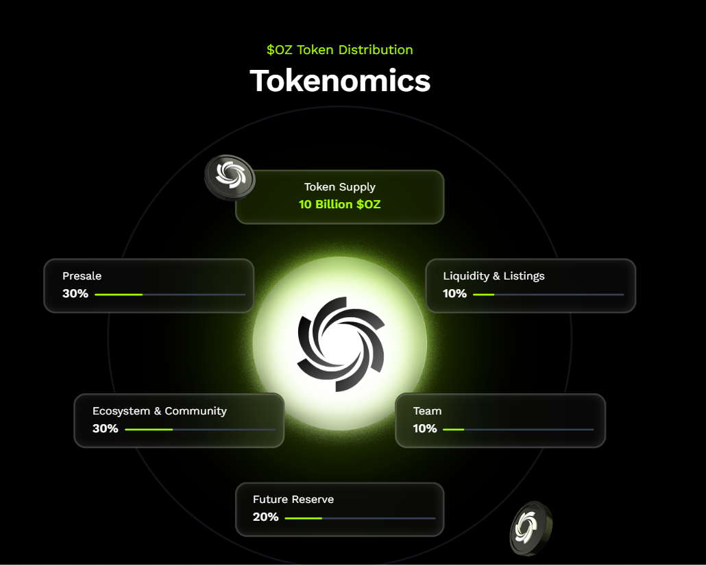 在代币经济模型方面,Ozak AI采用可持续分配策略:总供应量的60%专项用于预售、生态拓展和社区激励。这种平衡机制旨在增强流动性、奖励早期贡献者,并推动超越预售阶段的长期生态发展。
