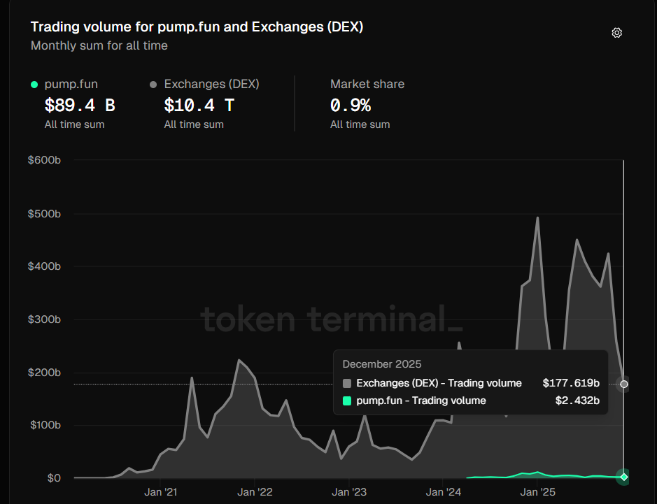 根据Token Terminal的数据,PUMP的月度交易量在2025年1月达到了117.5亿美元的历史最高点。此后交易量稳步下降,平台12月份的交易量仅为24.32亿美元。