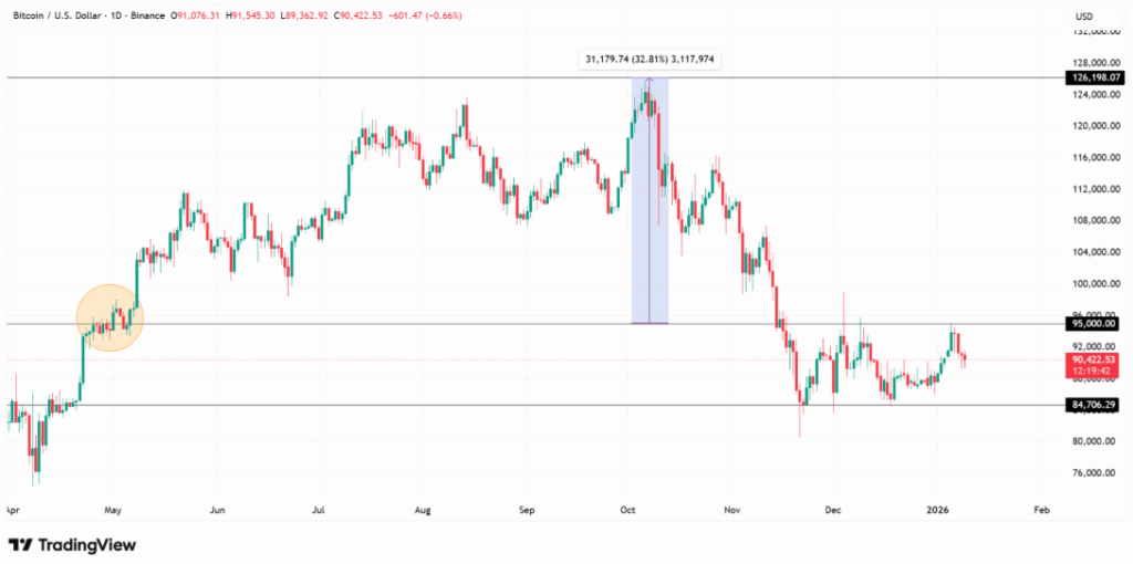 历史数据显示,Solana价格与比特币走势高度相关。当比特币成功突破重要阻力位(例如95,000美元区域)时,Solana通常随之走高,反映出市场流动性增加及投资者风险偏好上升。去年4月至5月比特币重新收复该水平时,便为后续上涨提供了稳固基础。Solana亦借此契机顺应市场积极势头,在去年10月触及126,198.07美元高点,期间涨幅超过32%。