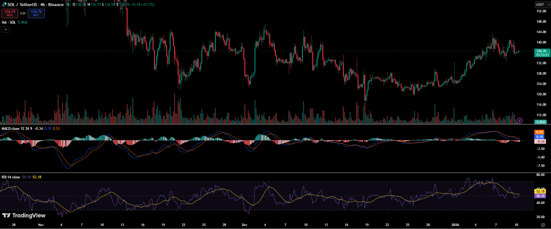 从市场角度看,Solana的价格走势反映了一段盘整期,而非压力期。在4小时图上,SOL一直在宽幅区间内交易,近期从12月120美元附近的低点回升后,稳定在130美元中段附近。其结构显示过去几周低点有所抬高,表明市场在逐步积累,而非积极抛售。