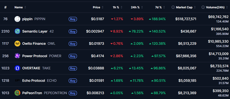 PIPPIN (PIPPIN): +187.62% (7日) | $0.5186 | 市值: $5.1866亿 | 交易量: $6969万 (24小时)