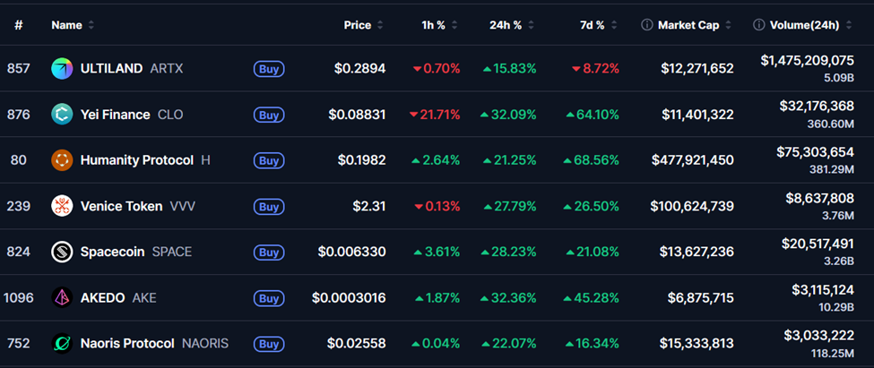 Yei Finance (CLO): -21.71% (1小时) | +64.10% (7日) | $0.08831 | 市值: $1140万 | 交易量: $3218万 (24小时)