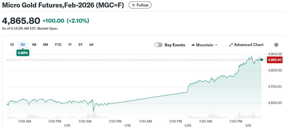 黄金价格在周三飙升至每盎司4800美元以上,创下历史新高。这一涨势由格陵兰岛相关的紧张局势和贸易战担忧所推动。