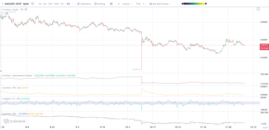 截至撰稿时,KAS价格徘徊在0.051美元左右,在小幅反弹后呈横盘整理态势。其结构显示高点不断下移,这表明买家尚未展现出真正的实力。即便是近期的反弹尝试,也未能收复11月中旬的破位水平。整体形态仍类似于受控的阴跌,尚未形成明确的突破结构。