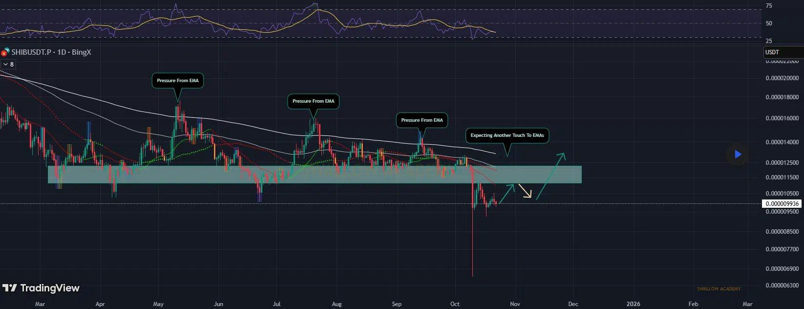 Shiba Inu在多个月下跌后稳定在0.000010美元支撑位附近,分析师预测这个缺口将很快填补。若突破EMA均线,可能迎来30%涨幅至0.00001299美元。虽然销毁率激增未能提振价格,但市场仍保持盘整态势。