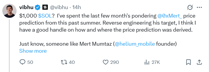 这一预测源于Helius Labs联合创始人Mert Mumtaz的估值模型。Solana基金会经理Vibhu近期重申,基于Solana有望成为支撑全球交易的金融网络,其代币价值将显著提升。