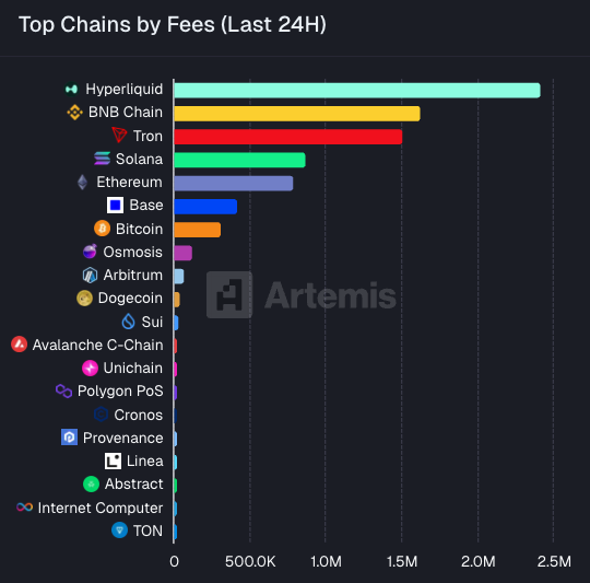 最新链上数据显示,Hyperliquid在费用生成和收入方面再度超越BNB Chain,过去24小时产生240万美元费用,高于后者的160万美元。