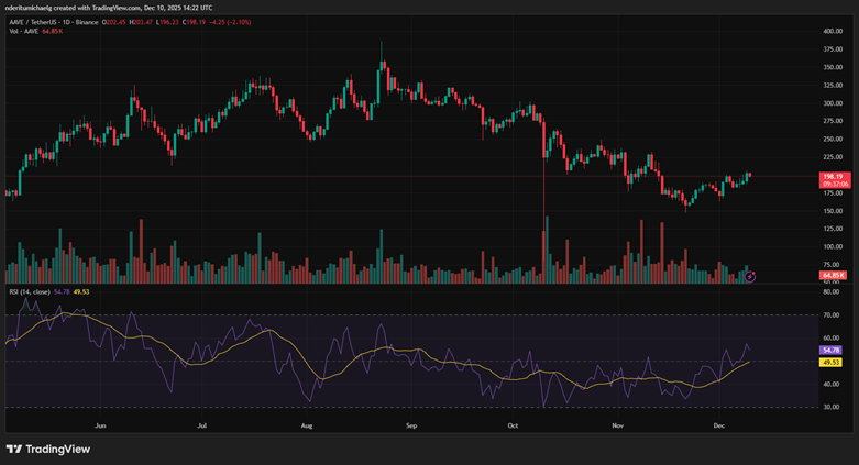AAVE价格在过去两周实现稳健回升,周二一度冲高至206美元,创下自11月中旬以来的最高价位。这是逾三周以来价格首次重返200美元关口,较11月局部低点涨幅超18%。截至发稿时,该加密货币交易价格为198美元。