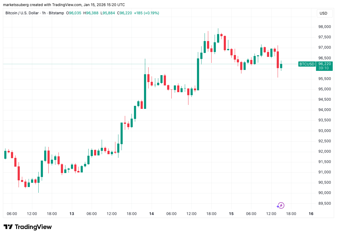 TradingView的数据显示,比特币价格较日内开盘下跌超过1%,在Bitstamp交易所跌至95,563美元低点。