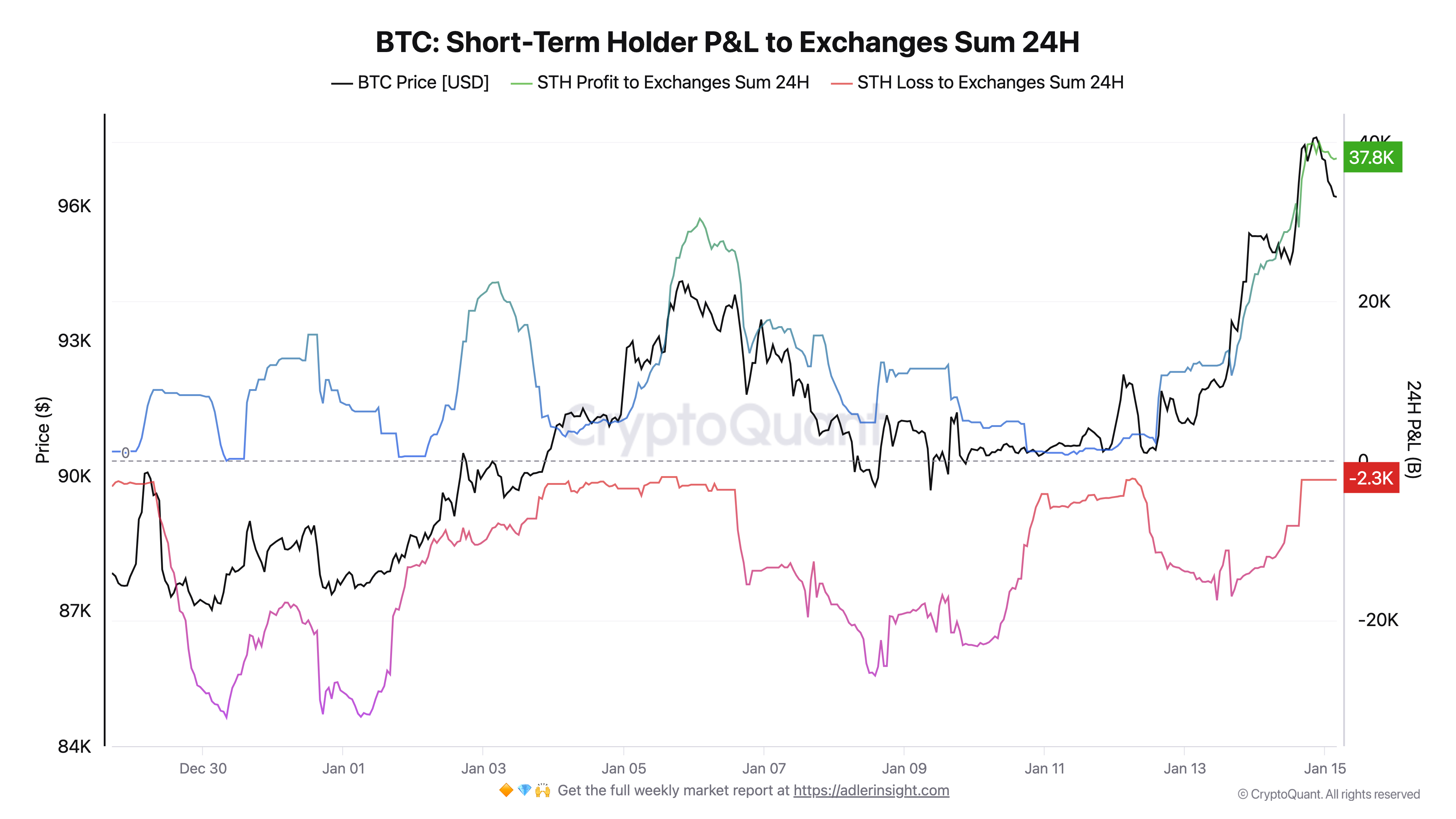 链上分析平台CryptoQuant揭示,较新的比特币投资者已经受到诱惑开始卖出。随着价格触及两个月高点,短期持有者——即持有比特币不超过六个月的实体——在24小时内向交易所发送了40,000枚比特币。