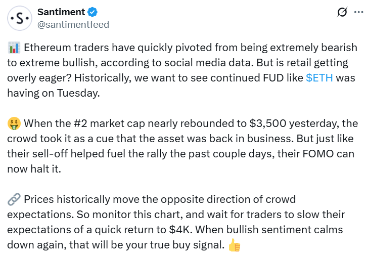 Santiment分析师指出:"以太坊交易者情绪已从极度看跌快速转向极度看涨",并补充说明价格反弹至3,500美元向加密社区释放了ETH重拾势头的信号。这种情绪转变体现在公开讨论和市场行为中,交易者对以太坊短期走势更加乐观。
