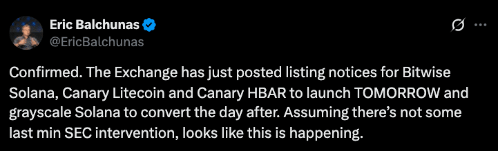 据彭博社分析师Eric Balchunas透露,交易所已发布公告,最早将于周二(10月28日)开启交易。