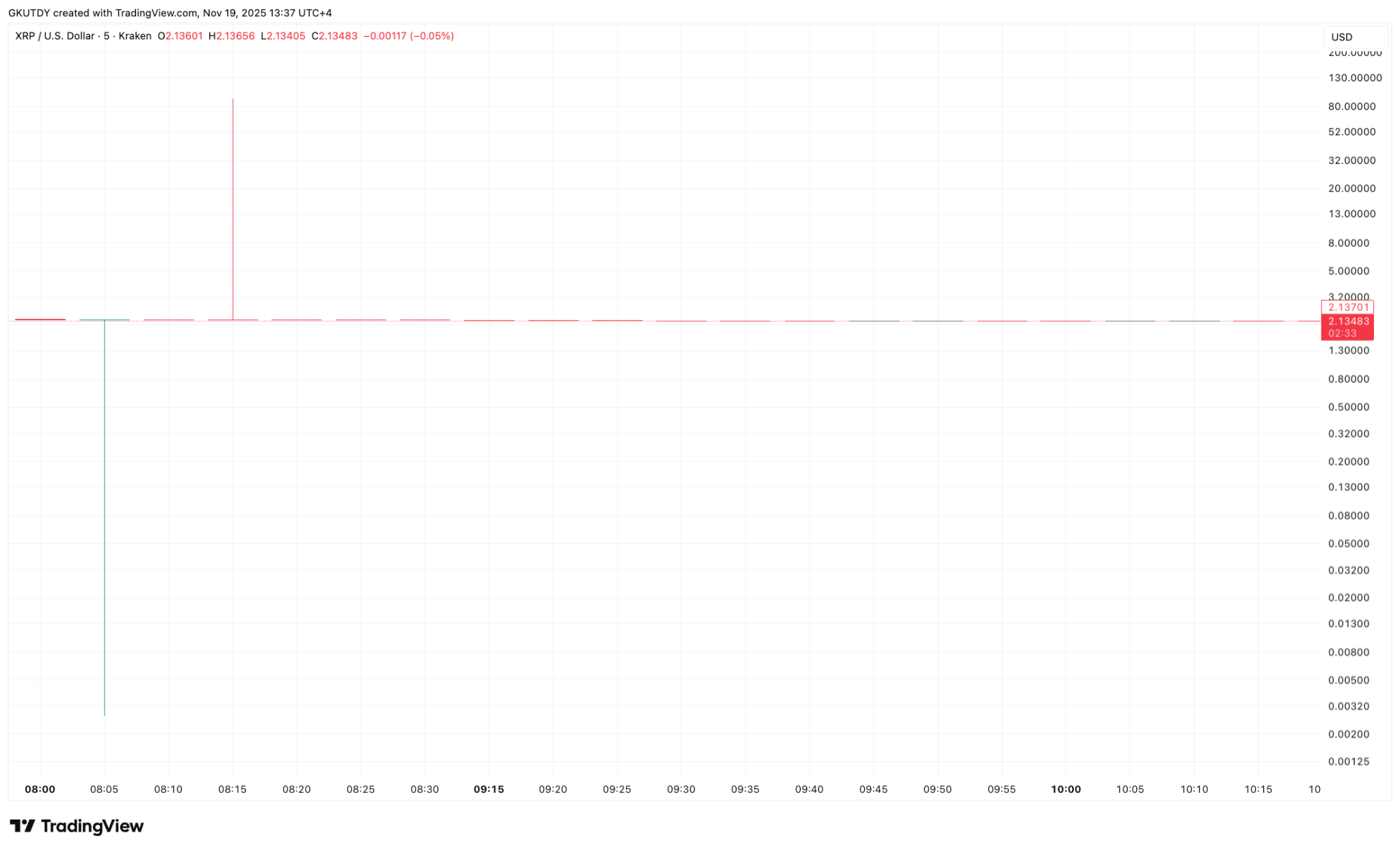 XRP:排除Kraken技术干扰后,实际价格稳定在2.13美元附近。