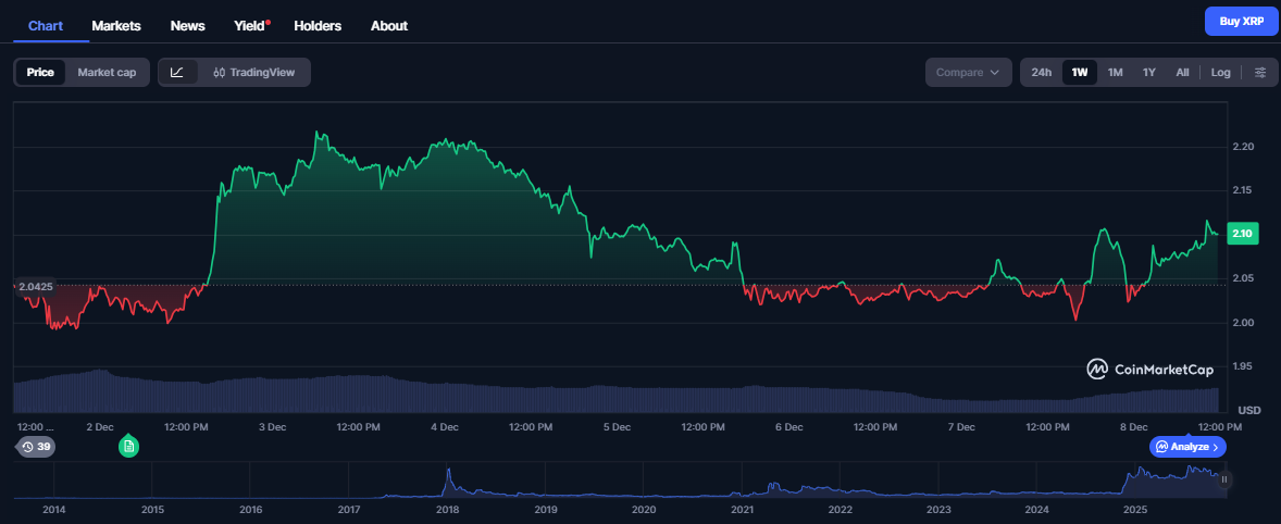 作为主流替代币之一,瑞波币近期呈现小幅上涨。CoinMarketCap数据显示,过去七天瑞波币价格从约2美元涨至2.1美元以上。虽然涨幅不大,但这仍然是一个积极的信号,因为XRP在30天时间范围内曾下跌近10%。