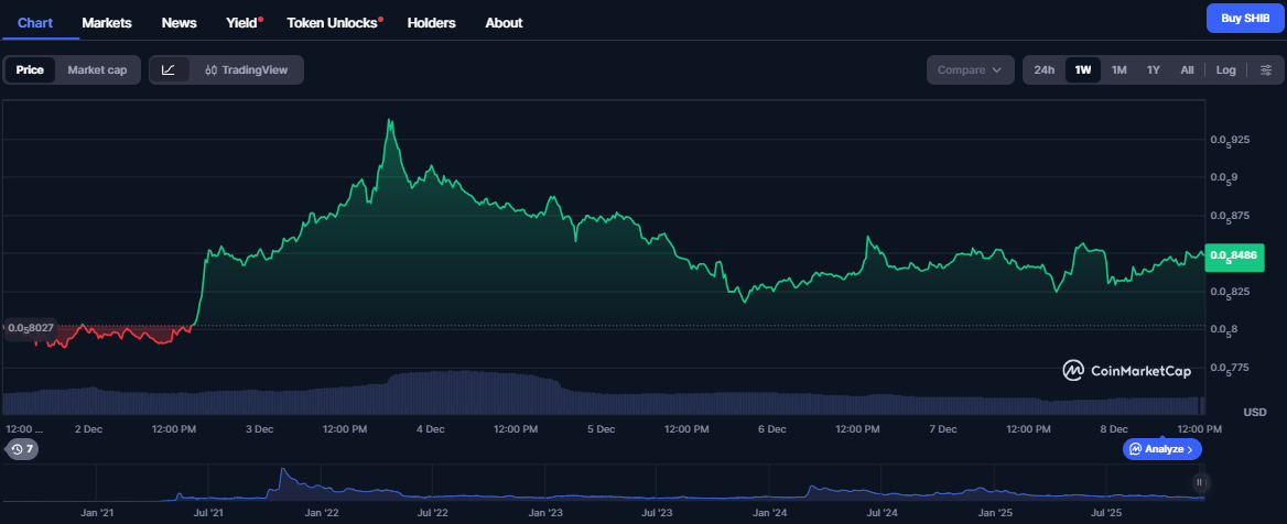柴犬币作为一种 meme 代币,近期也出现了一定增长。根据 CoinMarketCap 数据,其周线图显示价格从约0.0000080美元涨至0.0000085美元以上。尽管月度数据显示柴犬币下跌超过15%,但这一周度涨幅仍值得关注。