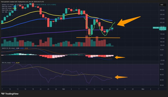 分析师Lark Davis(@TheCryptoLark)分享的图表显示,Solana多项技术指标呈现改善趋势。当前价格结构可能形成W型双底形态——这种形态通常在长期修正后预示趋势反转。Solana近期从170-175美元支撑区反弹,正测试50日均线阻力并向200美元心理关口迈进。