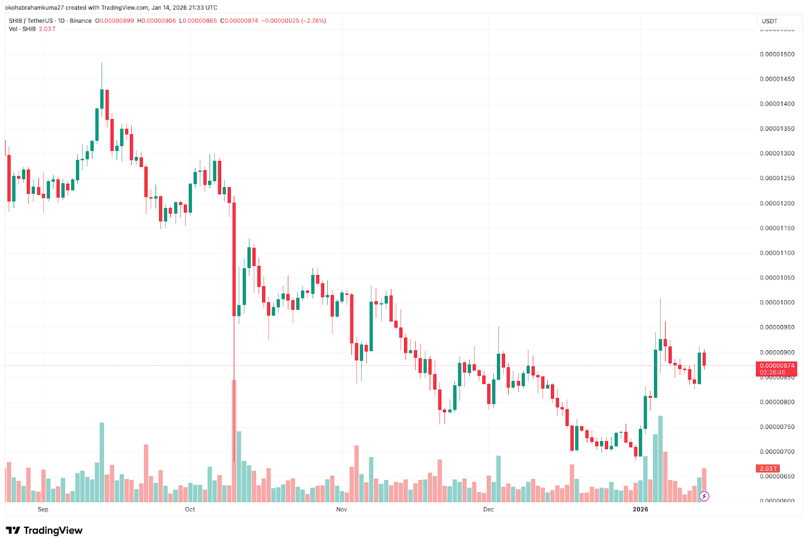 目前柴犬币的价格前景喜忧参半。尽管截至1月14日,其24小时交易量飙升79%,超过2.41亿美元,但价格走势却有所不同。过去七天,SHIB下跌了0.70%,表现逊于全球市场近5%的涨幅。