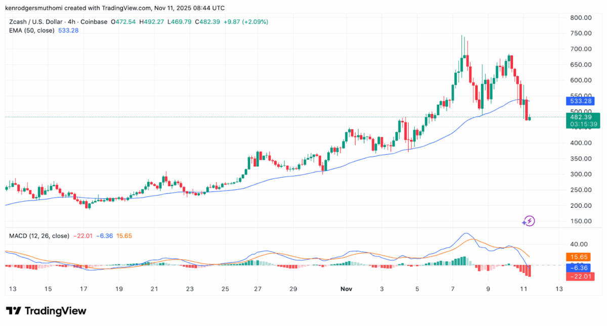 从4小时TradingView图表可见,Zcash此次修正伴随着明显技术弱势。虽然币价从470美元反弹至482美元附近,但仍低于当前位于533美元附近的50周期指数移动平均线(EMA)。该指标通过加权近期数据来辅助判断趋势转变。