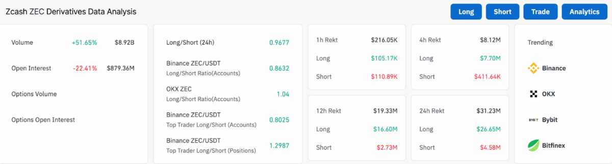 CoinGlass数据显示,Zcash衍生品交易量激增51.65%至89.2亿美元,但未平仓合约减少22.41%至8.7936亿美元,说明活跃合约数量下降。多空比率为0.97接近均衡,其中币安交易员略倾向做空,而OKX用户稍偏多头。