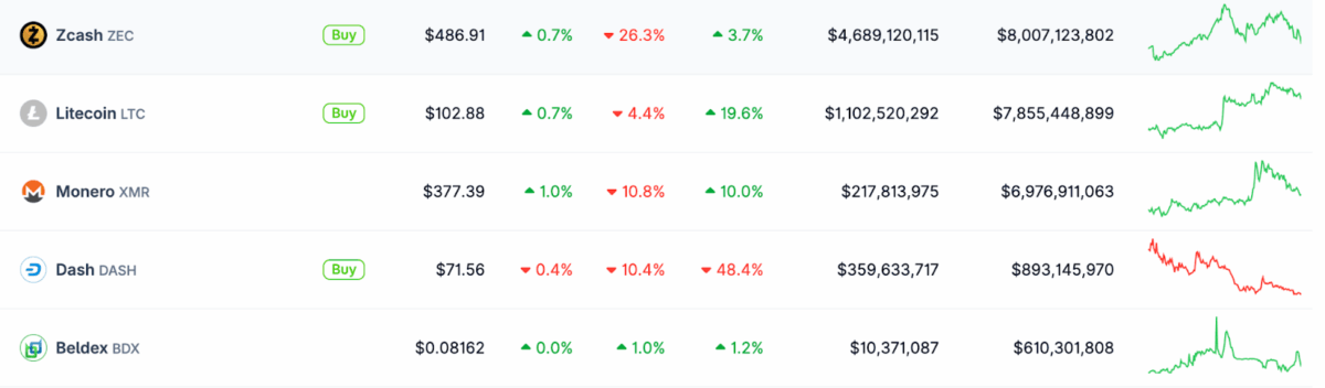 隐私币领域表现分化:Zcash领跑,门罗币(XMR)现报377.39美元单日微涨1%但月跌10.8%;集成可选隐私功能的莱特币(LTC)报102.88美元,单日涨0.7%周线大涨19.6%。达世币(DASH)和Beldex(BDX)则持续弱势,前者月跌10.4%,后者仅温和增长。