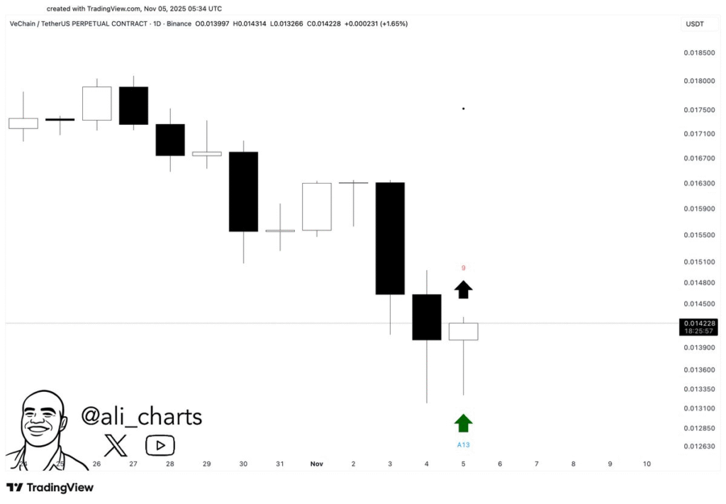 唯链($VET)近期技术指标表现亮眼,引发交易者关注。常用于识别趋势反转的TD序列指标接连触发两个关键买入信号:红色9计数和更具进攻性的13计数。这些信号通常被解读为潜在看涨反转的标志,暗示价格在近期下跌后可能转入上升通道。