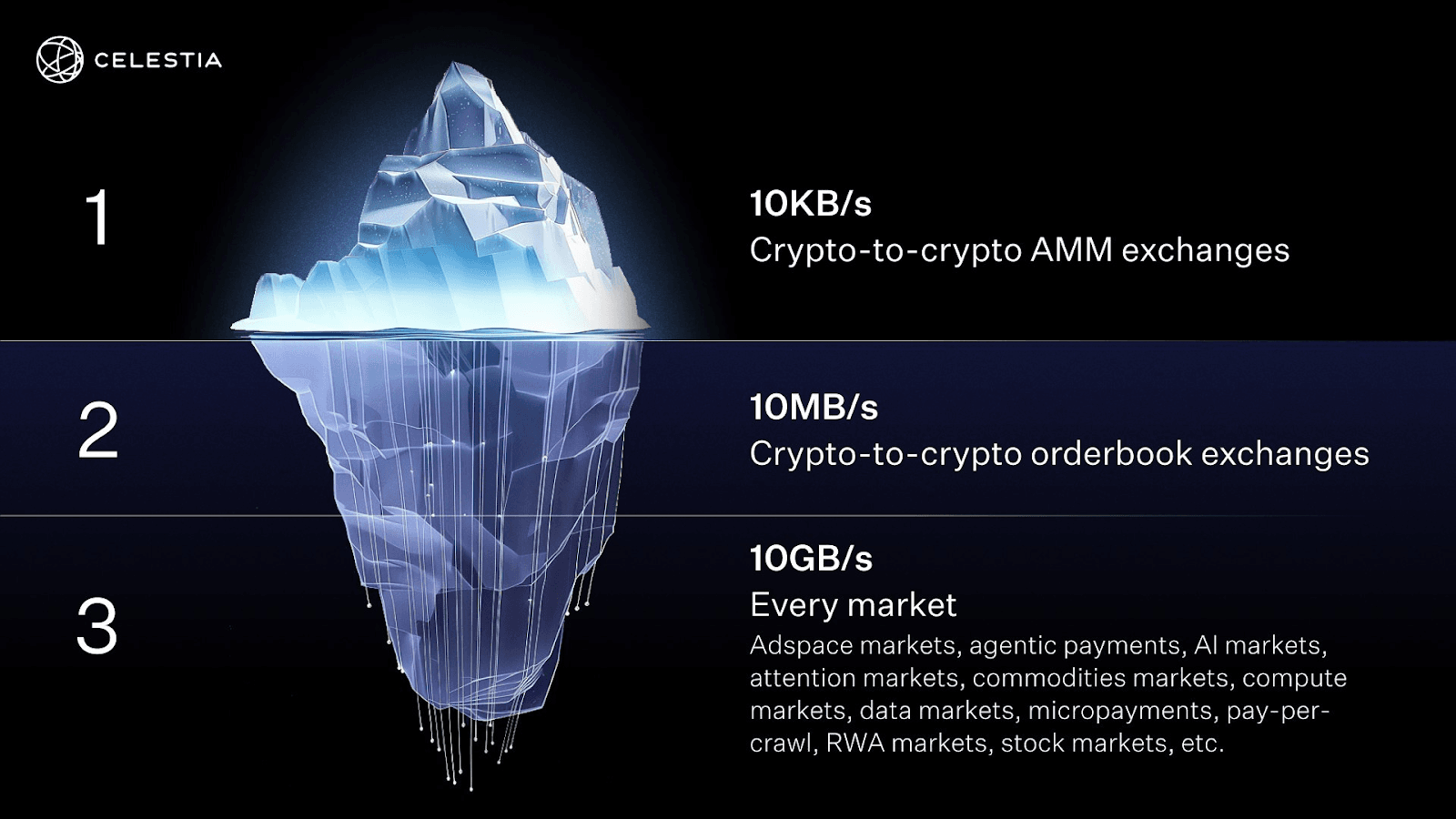 Celestia将区块链吞吐量演进划分为三个带宽阶段,每个阶段对应着不同的市场设计形态: